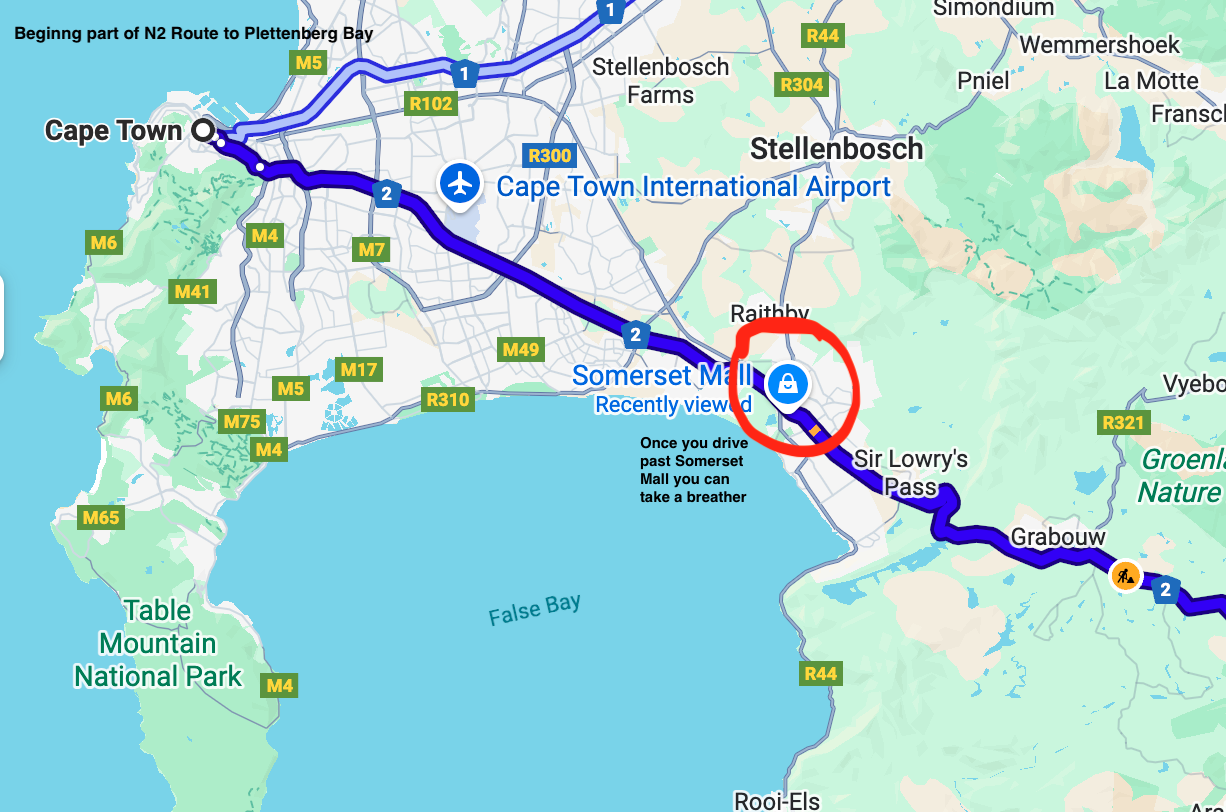 This is the route most people use and is a beautiful drive along the coast. You will use the same N2 section you used when coming from the airport. Once you are past the Somerset mall area (please see a screenshot), the drive is very relaxed and very scenic.